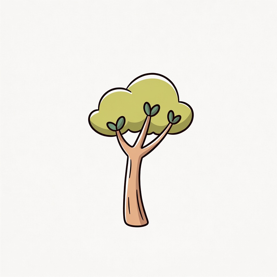 A simple cartoon illustration of a green tree with a brown trunk and multiple leafy branches. The tree stands alone on a white isolated background. It features thick outlines and a stylized, whimsical design.