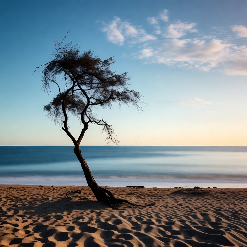 Solitary Tree on Beach at Sunset