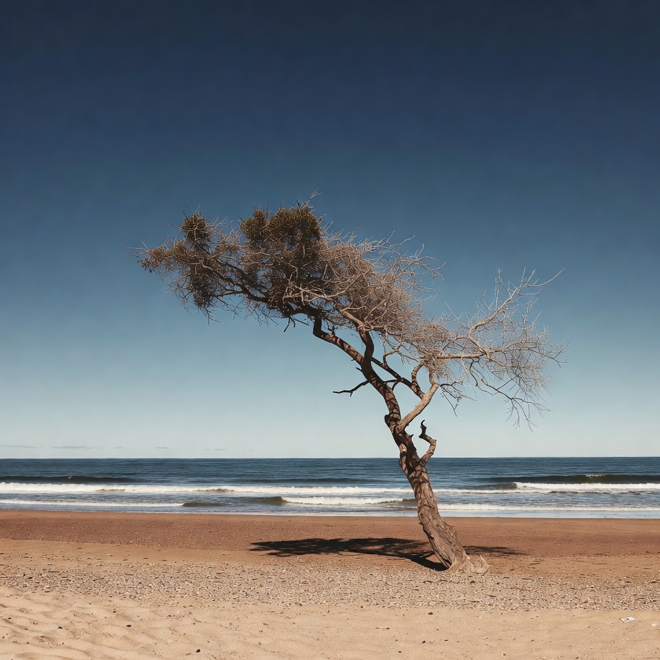 A solitary, twisted tree with sparse branches stands on a sandy beach. Gentle ocean waves lap at the shore under a clear blue sky. The tree casts a long shadow on the brown sand.