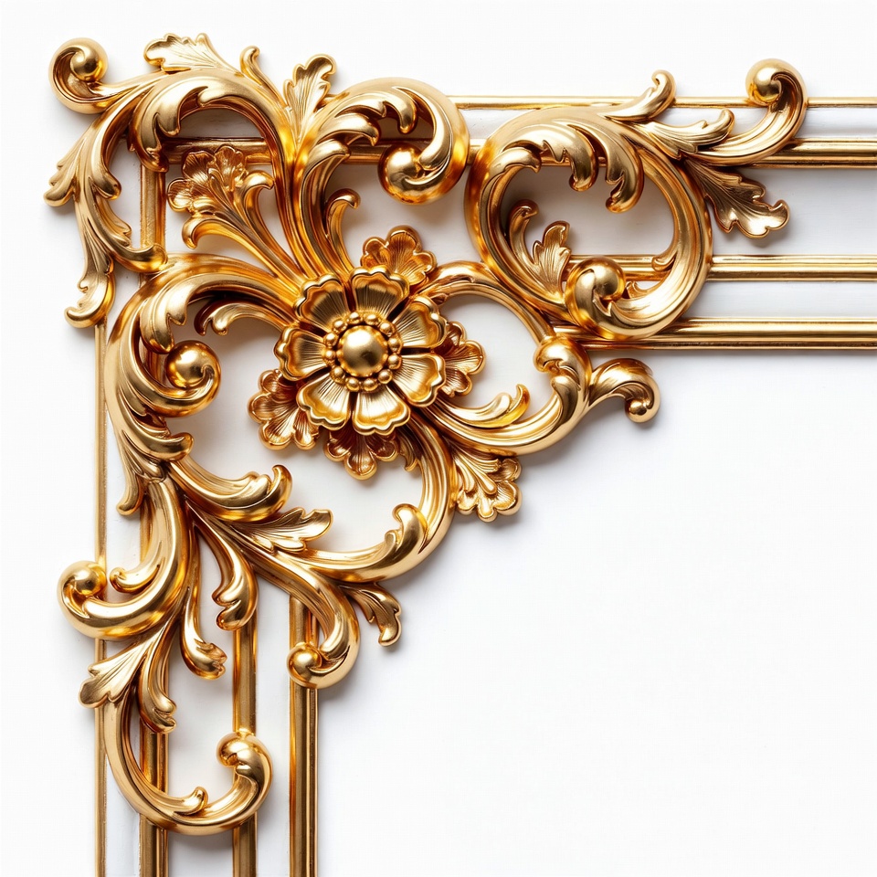 An intricate gold frame corner features elaborate baroque scrolls and floral motifs. A central flower with detailed petals sits amidst swirling vines and curves. The design is isolated on a white background.