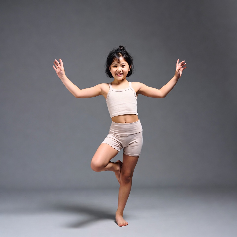 Asian, arms outstretched, bare feet, beige tank top, bun hairstyle, child, dancing, exercise, female, fitness, gray background, isolated background, kid, pose, short hair, shorts, studio, tree pose, yoga, young girl, girl