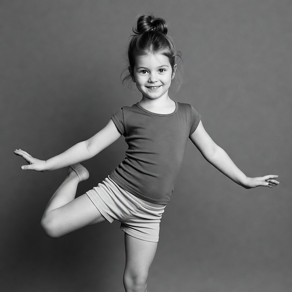 A young girl with her hair in a bun smiles while performing a ballet pose on a gray background. She wears a gray short-sleeved top and white shorts, with one leg lifted high and arms extended gracefully. The black and white photograph captures her joyful expression and balanced stance.