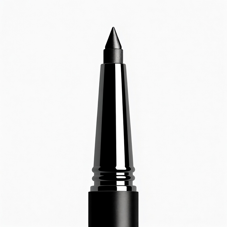 beauty product, beauty tool, black eyeliner, cosmetic, eye makeup, eyeliner pen, glossy black, isolated background, liquid eyeliner, makeup brush, makeup pen, pointed tip, precision eyeliner, white background, eyeliner