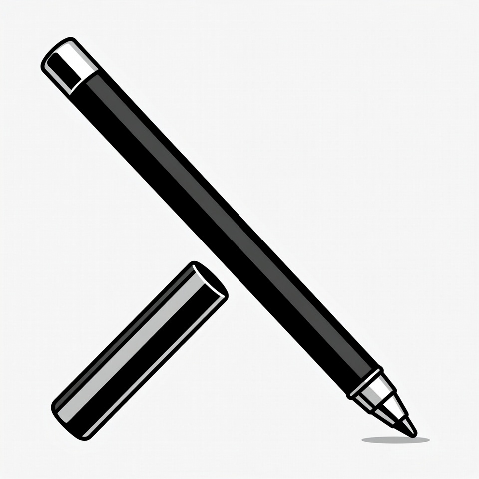 A simple line art illustration of a black pen with a silver tip and matching cap detached beside it. The pen is angled diagonally on a white isolated background. The design features clean outlines and minimal shading.