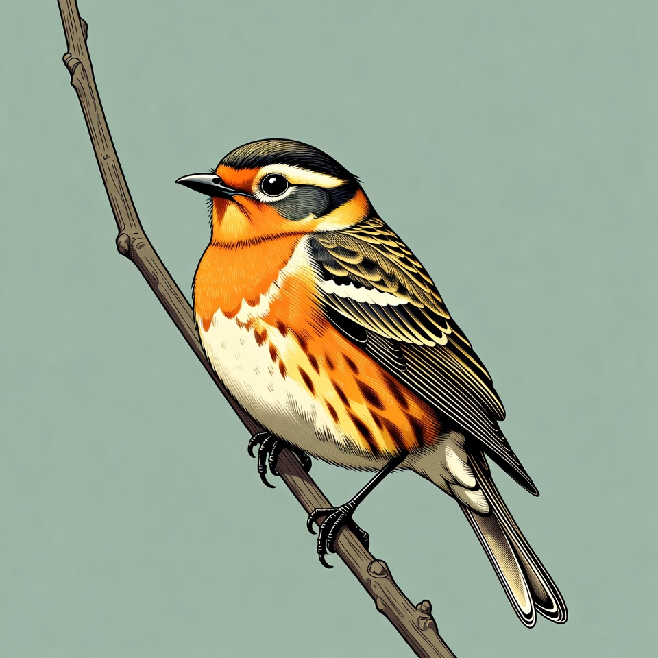 A detailed illustration of an American Redstart bird perched on a thin branch. The bird features vibrant orange and black plumage with white underparts, yellow highlights on the wings, and a striking facial pattern. It is set against a light teal background.
