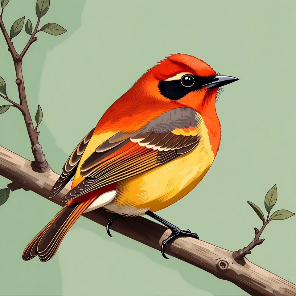 A vibrant red bird with a striking red crest, black eye mask, and yellow underbelly perches on a thin branch. It features orange wings with gray and yellow accents, surrounded by green leaves against a light green background. The illustration has a detailed, colorful digital art style.