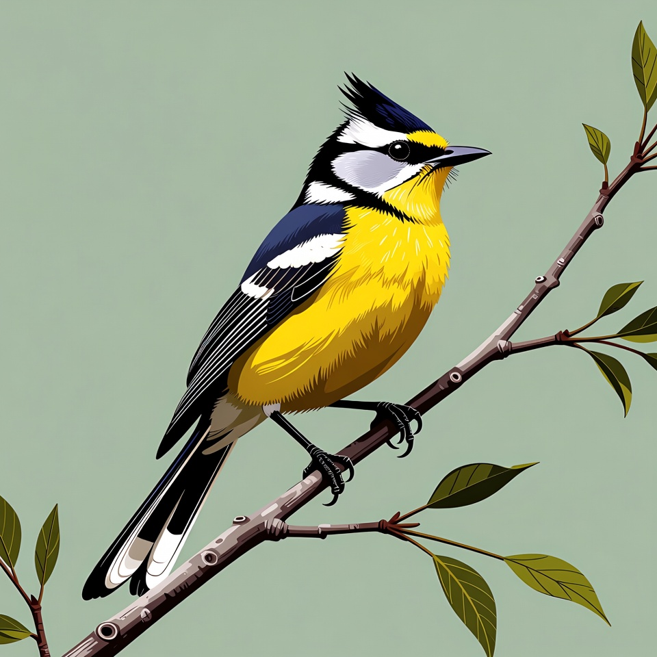A vibrant illustration of a crested tit bird perched on a thin branch with green leaves. The bird features bright yellow plumage, black and white facial markings, a prominent blue-black crest, and blue wings. It stands against a light green background.
