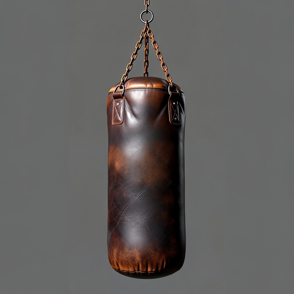3D render, boxing, boxing equipment, brown leather, chains, fight gear, fitness, gym equipment, hanging bag, heavy bag, isolated background, leather bag, martial arts, punching bag, speed bag, training gear, boxing bag
