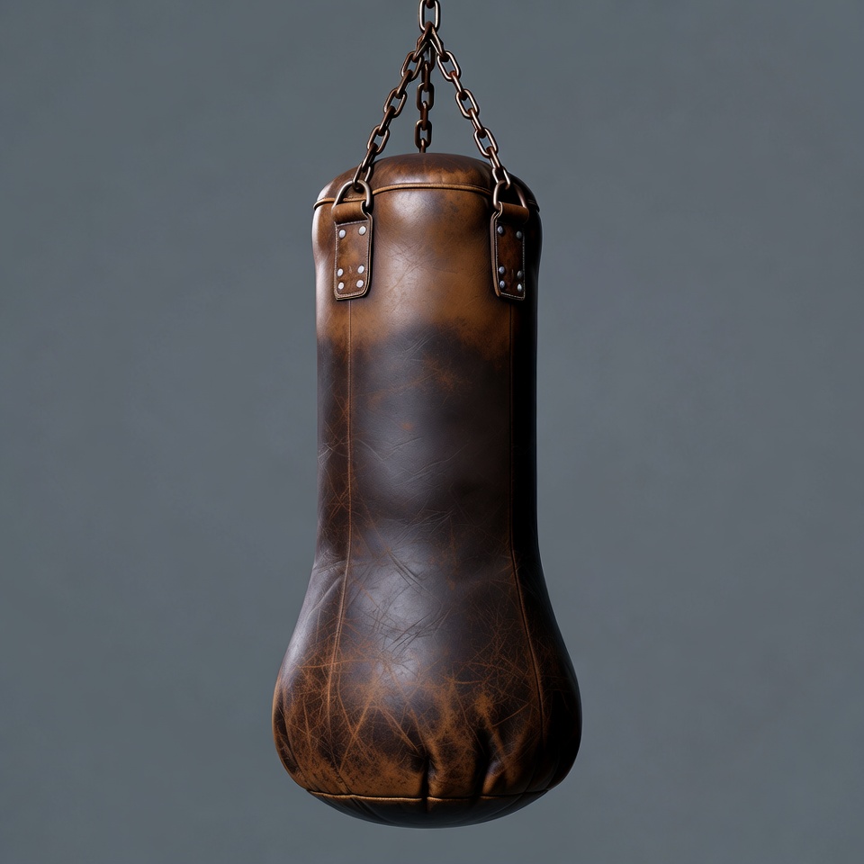 3D render, boxing equipment, boxing gear, brown leather, chains, fight training, gray background, gym equipment, hanging bag, heavy bag, isolated background, leather bag, martial arts, metal chains, punching bag, sports equipment, textured leather, vintage bag, workout gear, boxing bag