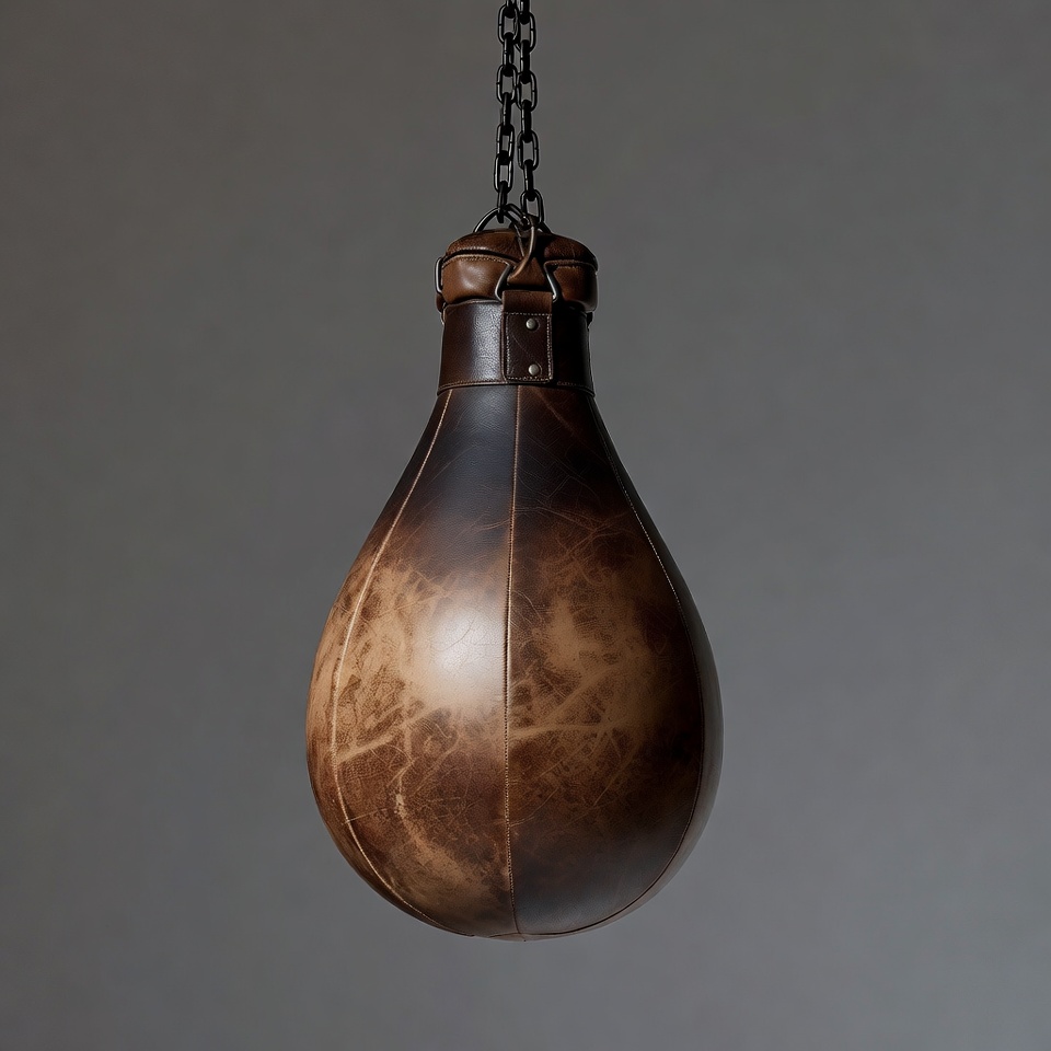 boxing bag, boxing equipment, brown leather, chains, combat sports, fitness gear, gray background, hanging bag, heavy bag, isolated, leather bag, pear shaped, vintage bag, punching bag