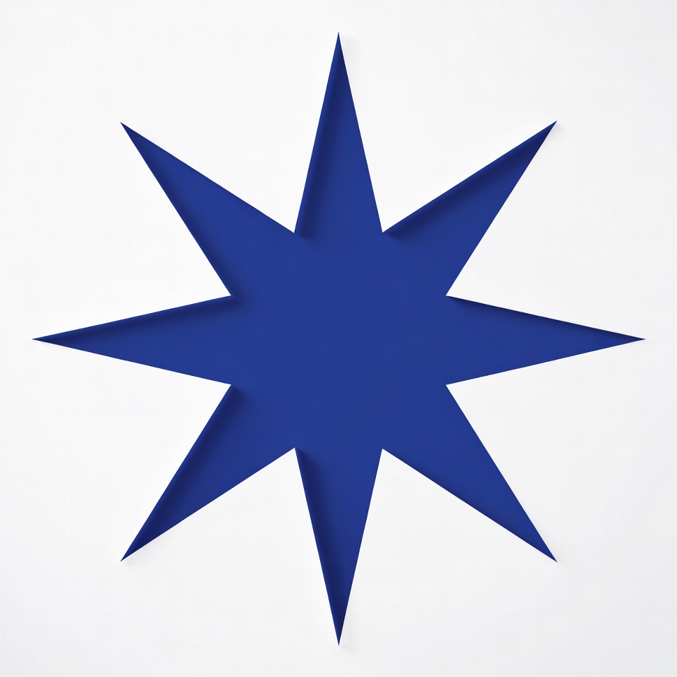 A vibrant blue eight-pointed star with a 3D cutout design floats against a plain white background. The star features sharp, angular points and a glossy metallic appearance. It is centered and isolated for clear visibility.