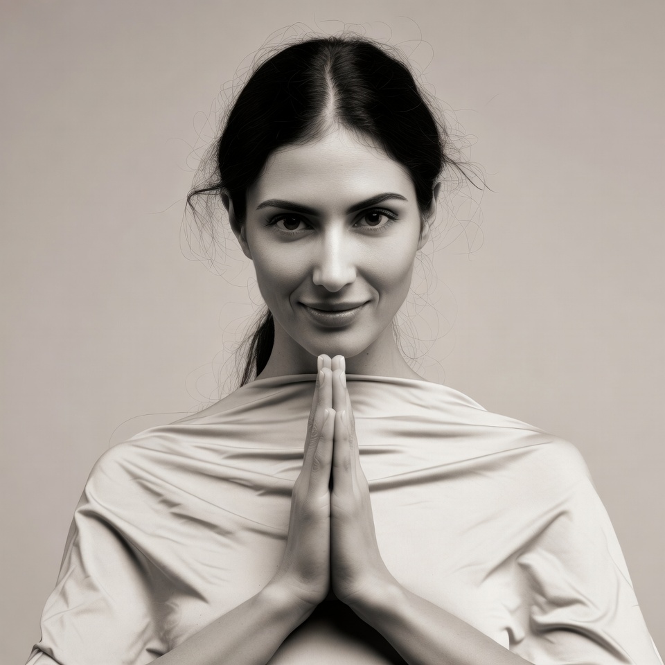 A woman with long dark hair stands against a light beige background in a black and white photo. She presses her palms together in a prayer gesture at chest level and smiles softly at the camera. She wears a draped light-colored fabric over her shoulders.
