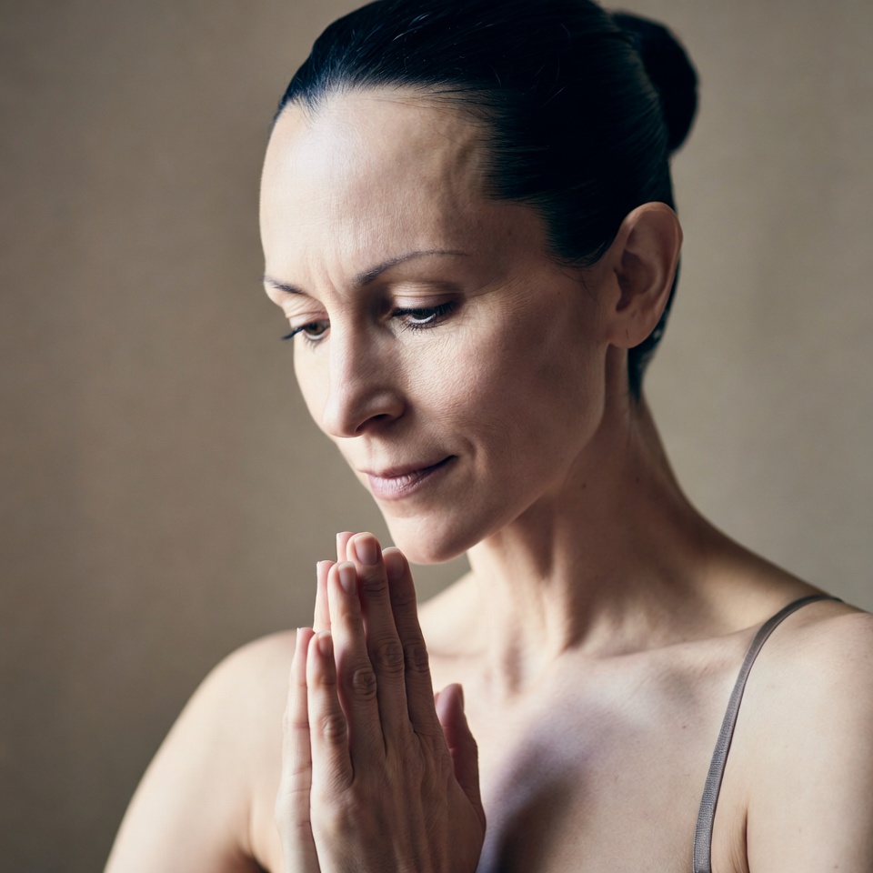 A woman with black hair in a bun clasps her hands together in a prayer gesture. She wears thin gray straps over her shoulders and gazes downward thoughtfully. The image features a soft beige background.