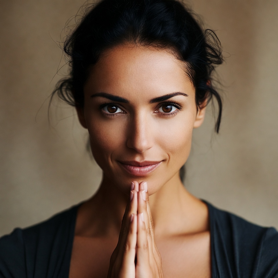 A beautiful woman with long dark hair styled loosely presses her palms together in a prayer gesture. She has warm brown eyes, full lips with a subtle smile, and warm tan skin. She wears a dark v-neck top against a neutral background.