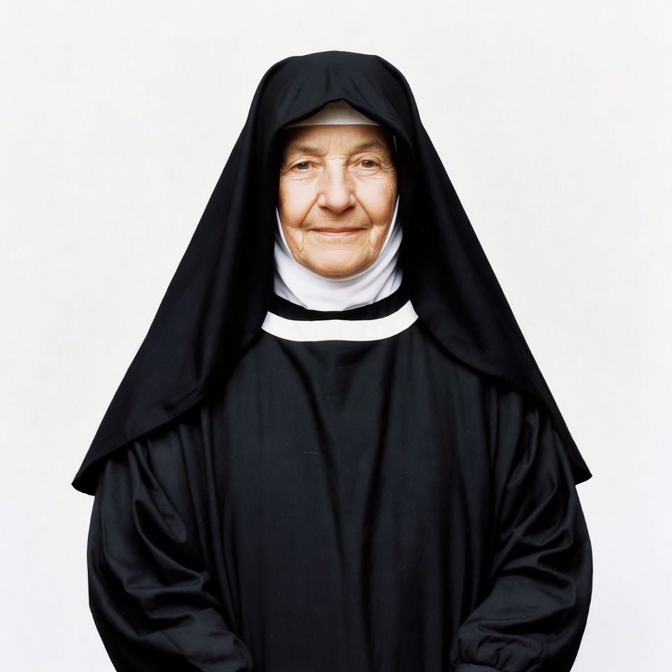 Catholic nun, White, black habit, elderly woman, gentle smile, habit veil, isolated background, portrait, religious habit, religious woman, smiling nun, standing, traditional clothing, white wimple, woman, nun