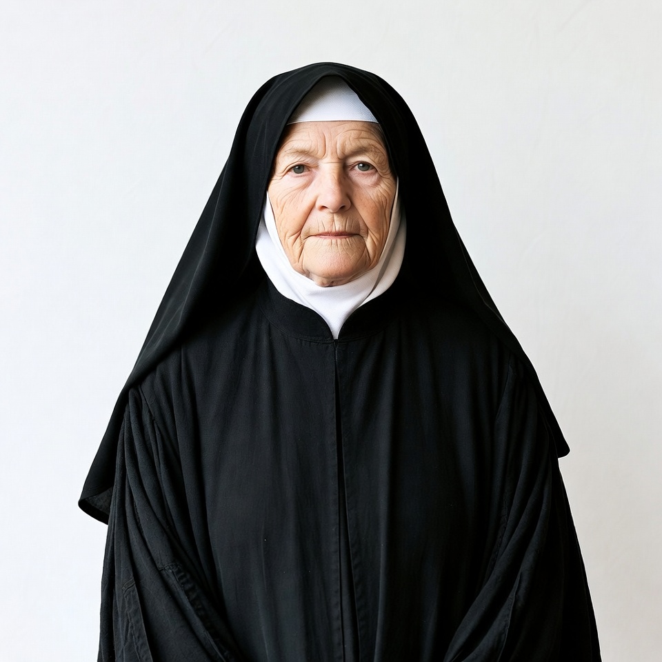Catholic nun, White, black habit, elderly woman, female, habit veil, old woman, portrait, religious habit, religious woman, senior nun, standing pose, traditional clothing, white background, white coif, wimple, woman, nun