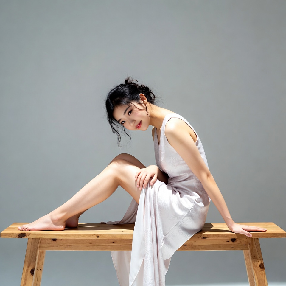 A young Asian woman with long black hair in an updo sits sideways on a wooden bench. She wears a sleeveless pale pink dress with a flowing skirt and gazes softly to the side. Her bare feet rest on the bench against a plain gray background.