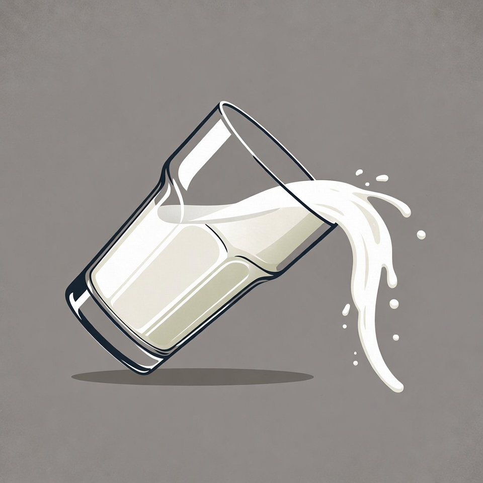 A clear glass tumbler tilts on a gray background, spilling white milk in dynamic splashes. The illustration features smooth lines and a subtle shadow beneath the glass. Milk droplets scatter outward from the pour.