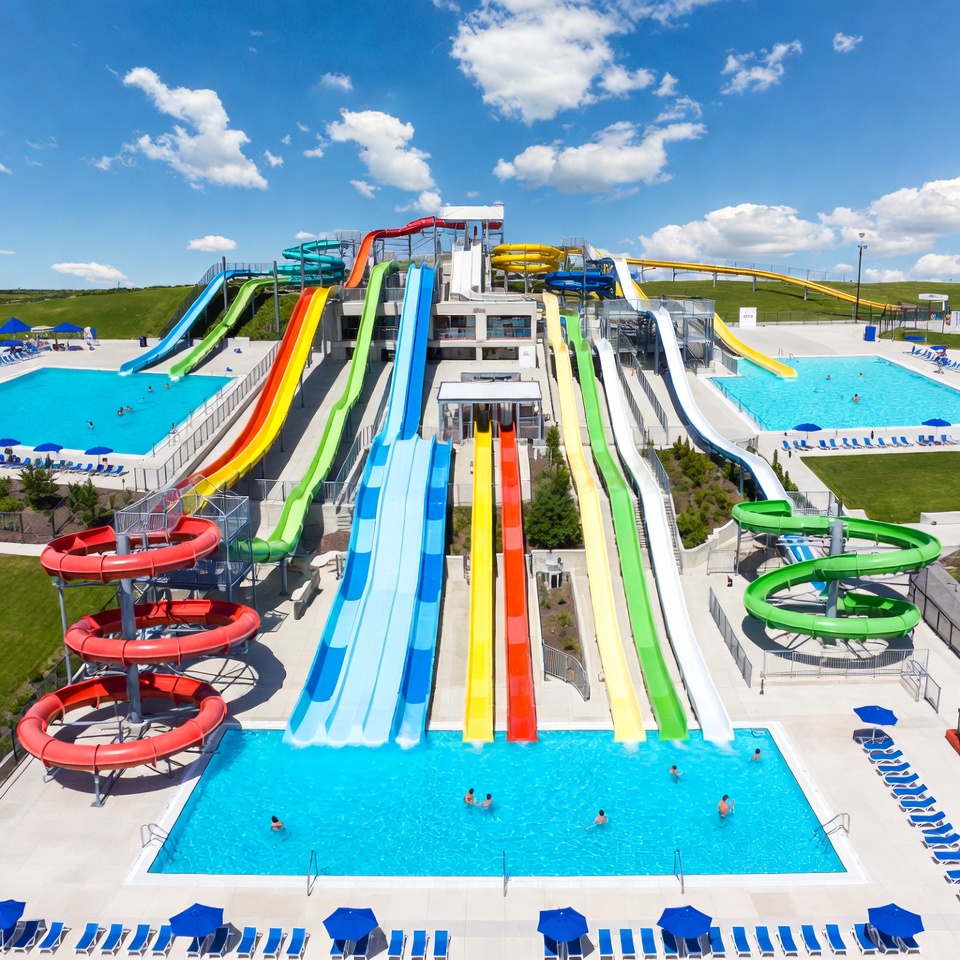 aerial view, blue sky, blue slide, clouds, colorful slides, green slide, outdoor park, people, pools, red slide, summer fun, swimming, swimming pools, umbrellas, water slides, yellow slide, water park