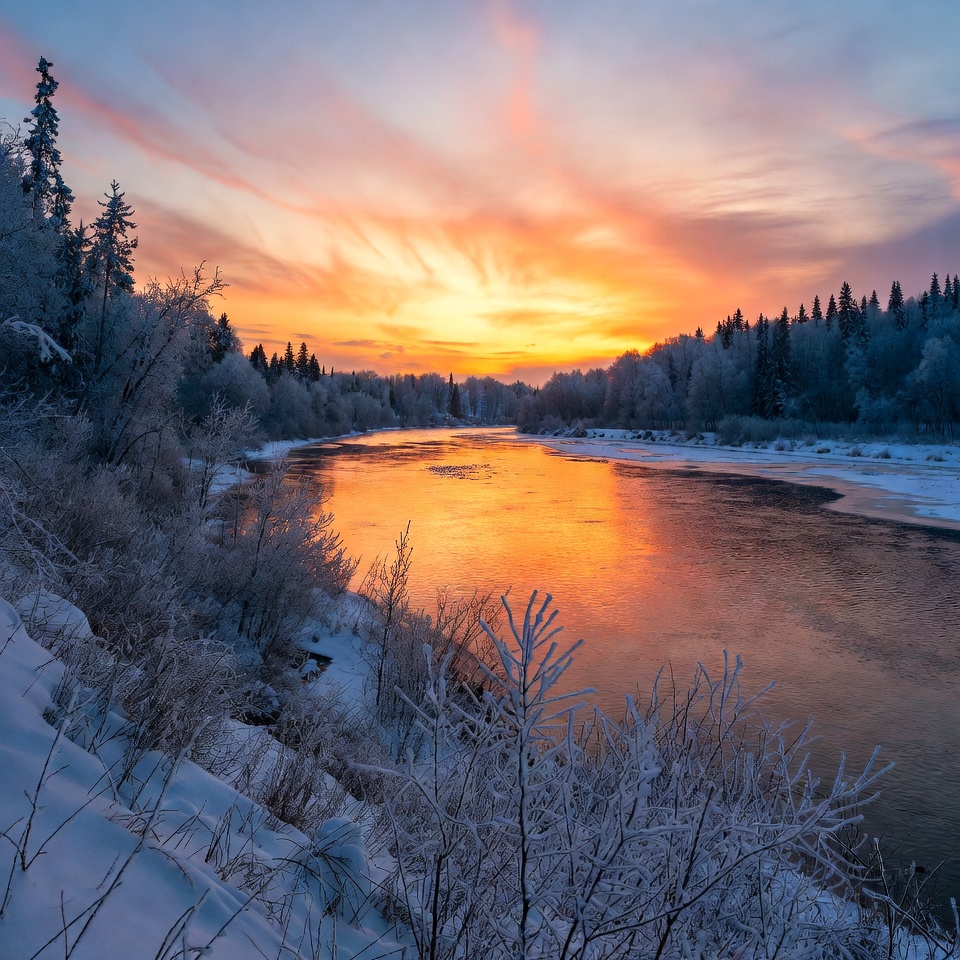 A serene river reflects a vibrant orange and pink sunset in a snowy winter landscape. Snow-covered trees and bushes line the riverbanks under a sky streaked with clouds. The water partially frozen captures the warm glow of the setting sun.