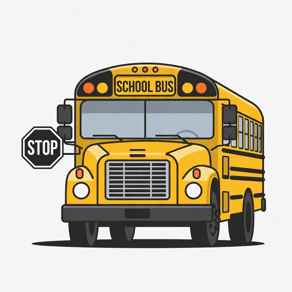 A vibrant yellow school bus illustration features bold 'SCHOOL BUS' lettering on the front and side. A red octagonal stop sign extends from the left side, with headlights illuminated. The bus is depicted on a white background with a subtle shadow.