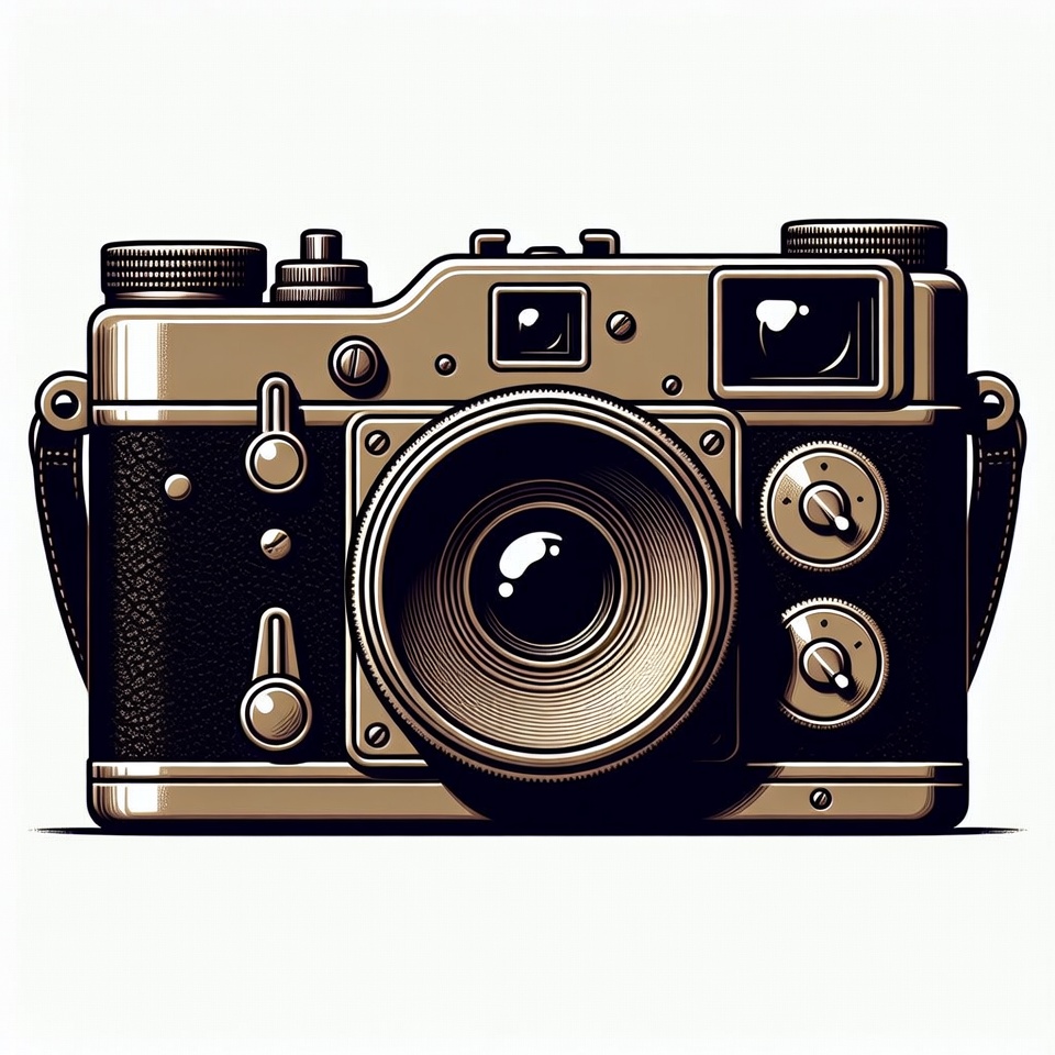 A detailed line art illustration of a classic vintage camera with a large lens and leather strap. The camera features intricate knobs, dials, and a viewfinder in sepia tones. It is centered on an isolated white background.