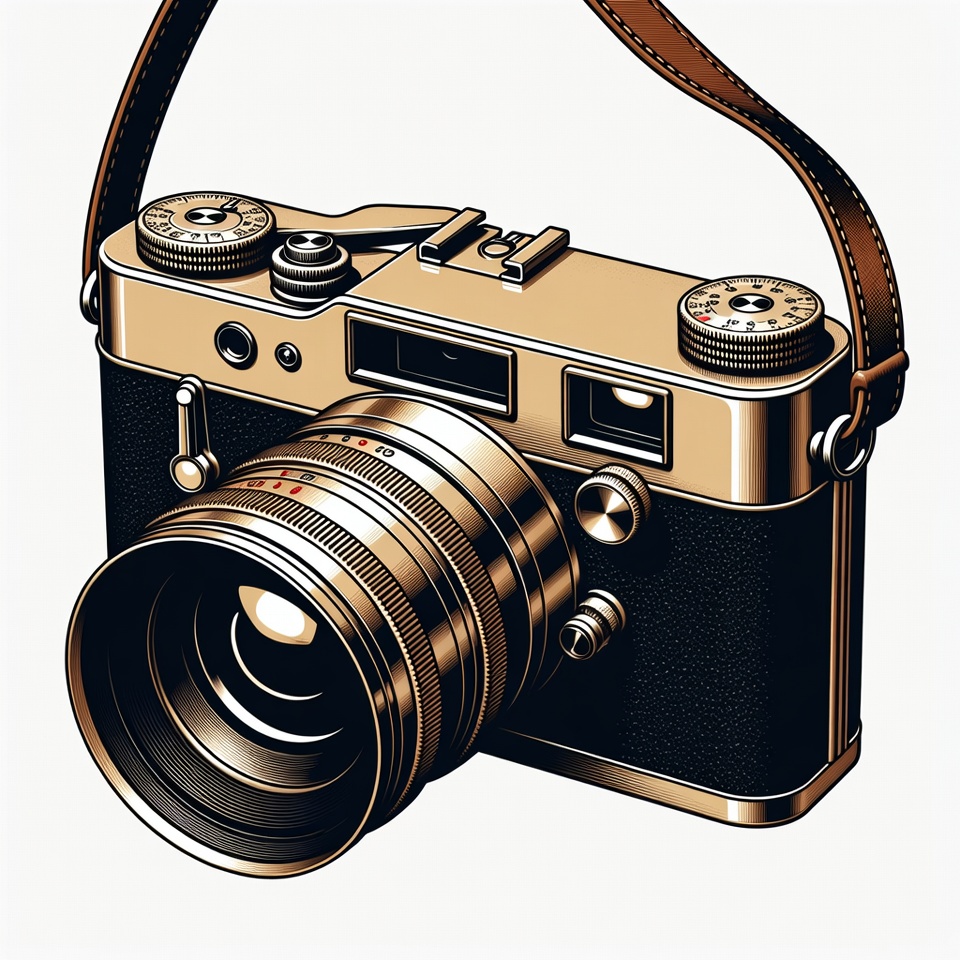 A detailed illustration of a vintage camera with a black body, gold accents, and a large lens. It features multiple dials, knobs, and a brown leather strap draped over it. The camera is depicted in a realistic style on an isolated white background.
