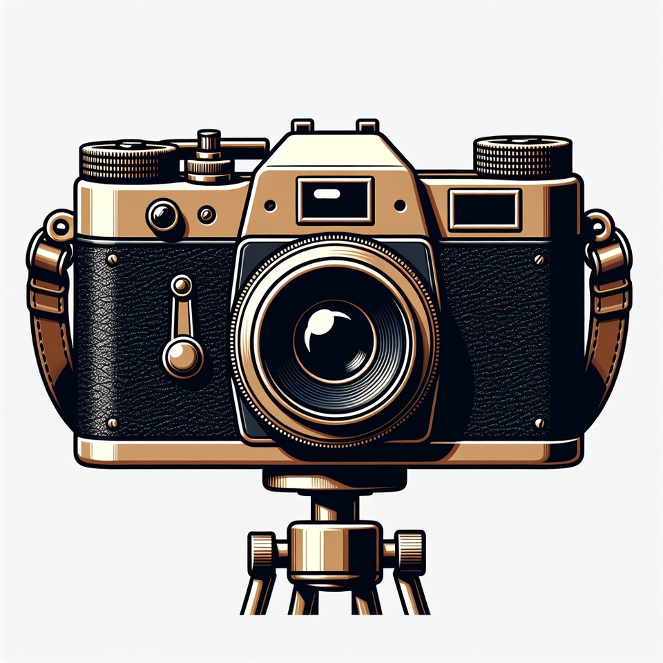 A detailed illustration of a classic vintage camera with leather body, brass accents, and a large lens. The camera features a shoulder strap and is mounted on a tripod with metallic legs. It is presented against an isolated white background.