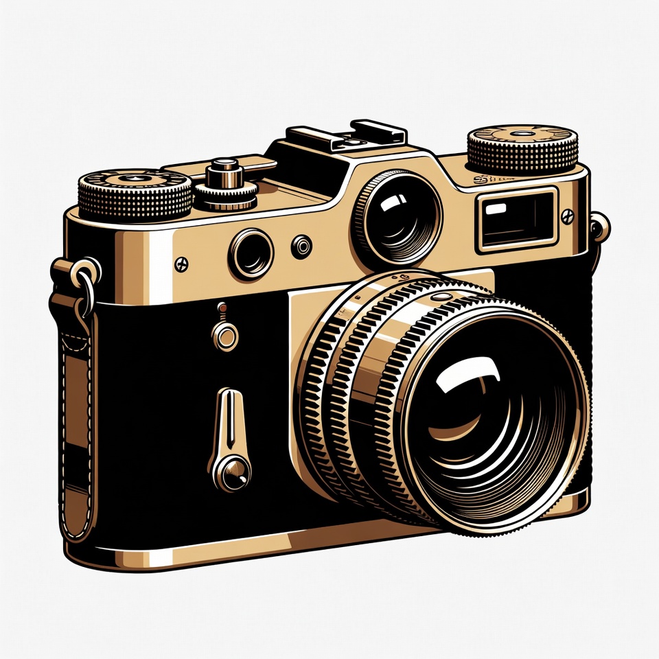 black camera, camera lens, camera strap, classic camera, clipart, film camera, gold accents, illustration, isolated background, photography equipment, retro camera, vector art, viewfinder, vintage camera