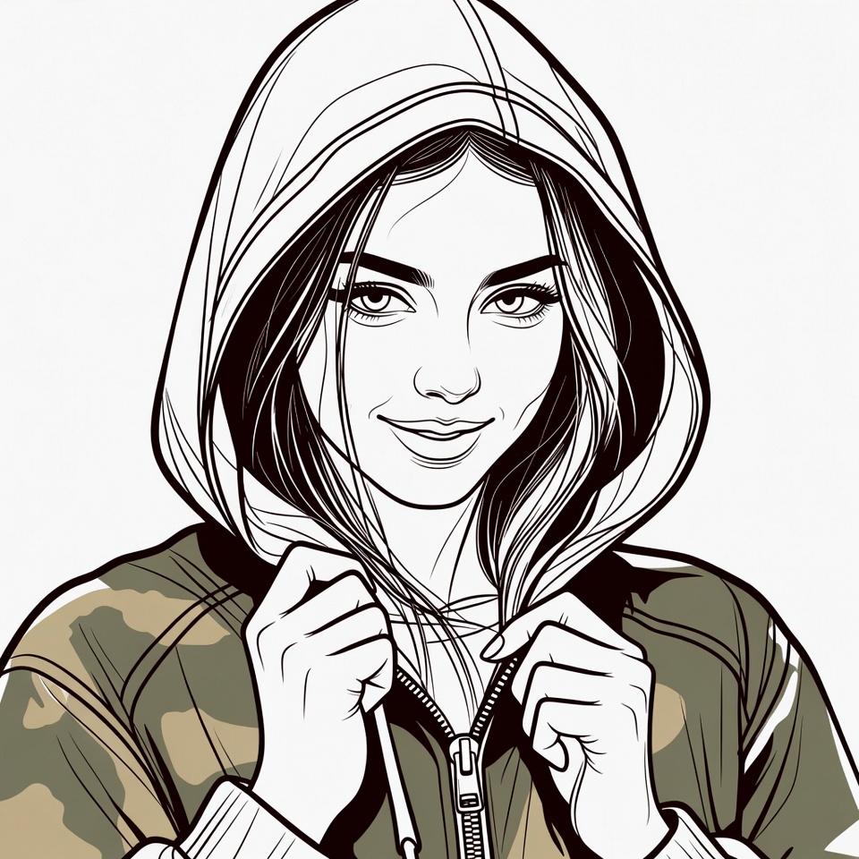Line art illustration of a young woman with long hair wearing a hooded camouflage jacket. She smiles gently with hands holding the open zipper in front. The drawing features bold outlines on an isolated white background.