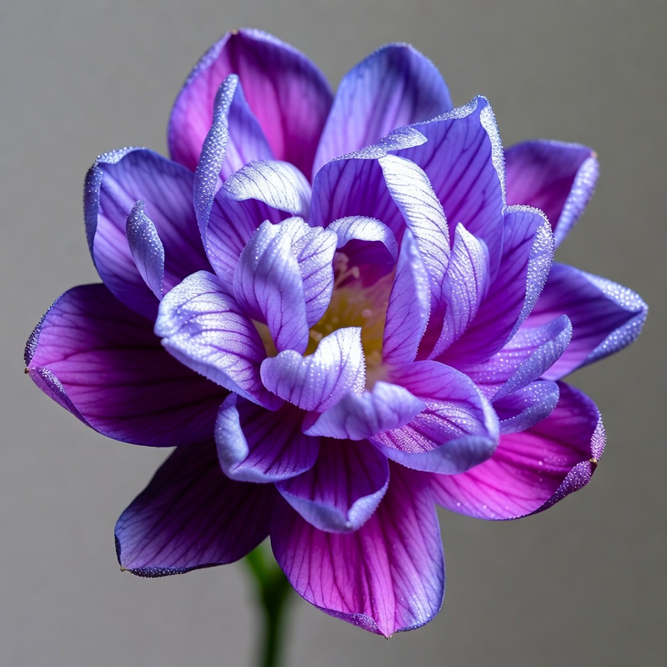 bloom, blossom, blue purple hue, dew drops, elegant flower, floral, flower closeup, green stem, isolated background, lily, macro photography, nature, petals, plant, striped petals, vibrant purple, water droplets, white stripes, purple flower