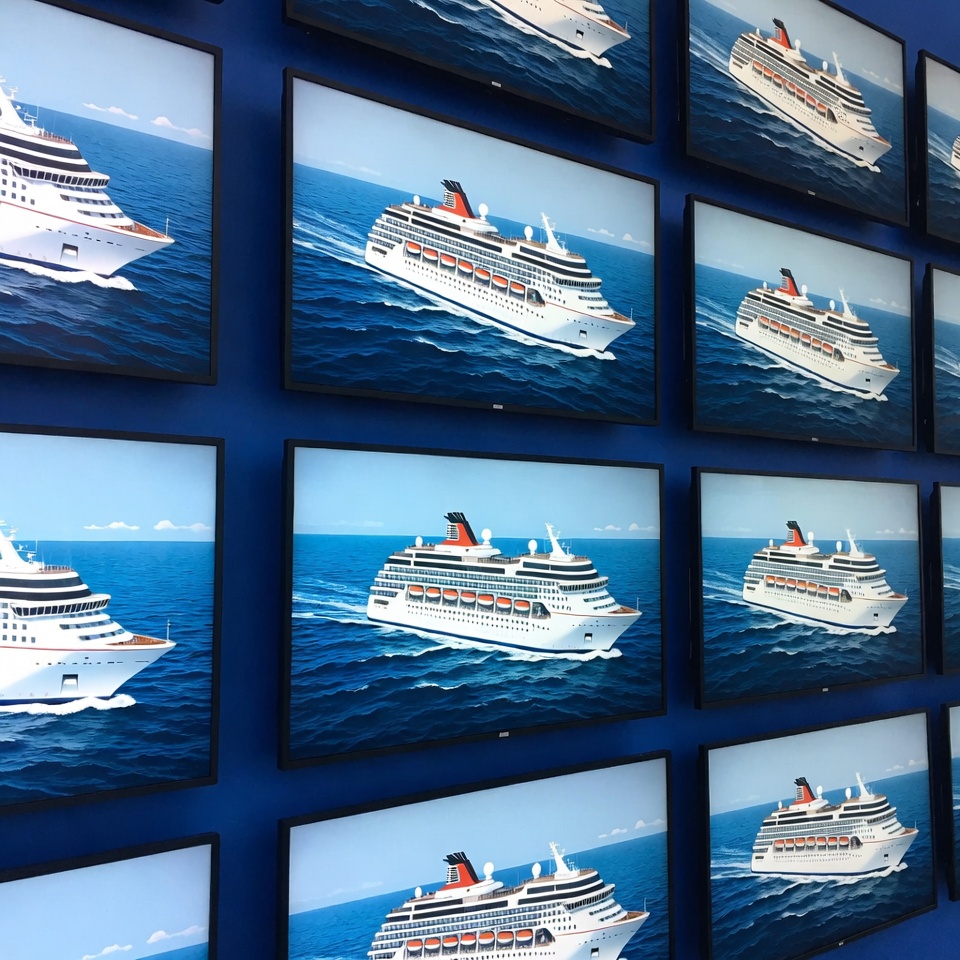 A blue wall displays multiple flat-screen monitors arranged in a grid. Each screen shows a large white cruise ship with orange funnels sailing on blue ocean waters under a clear sky. The images are uniformly oriented and brightly lit.