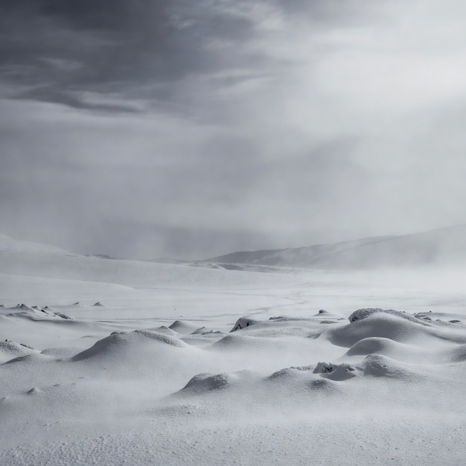 arctic scene, blizzard, blowing snow, clouds, cold weather, foggy horizon, frozen terrain, gray sky, ice, mountains, powder snow, remote wilderness, snow, snowdrifts, winter, snowy landscape