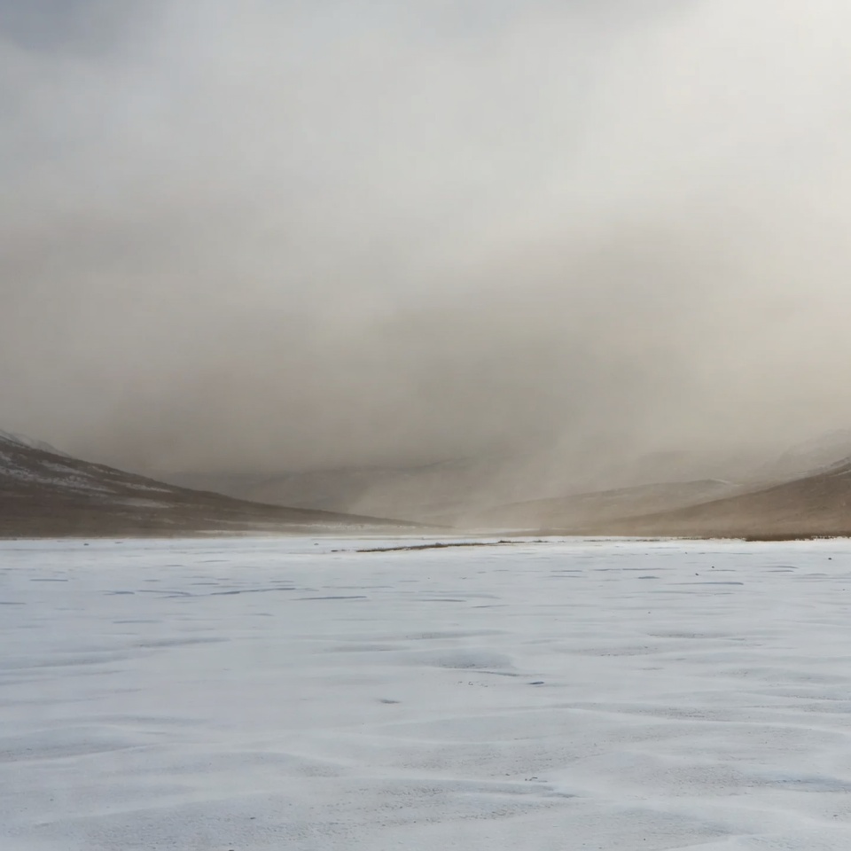 arctic scenery, cloudy sky, cold weather, fog, foggy horizon, frozen valley, grey sky, hazy mountains, icy terrain, mist, mountain pass, mountains, natural landscape, remote wilderness, ridges, snow plain, snowy peaks, white snow, winter landscape, snowy valley