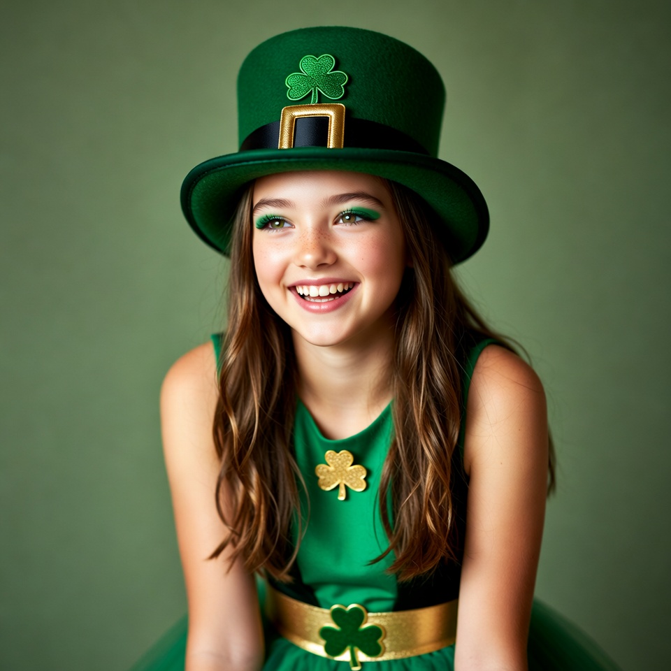 A young girl with long brown hair smiles happily while wearing a tall green leprechaun hat adorned with shamrocks and a gold buckle. She is dressed in a green sleeveless dress with gold shamrock accents and a gold-trimmed belt. The image features a solid green background.