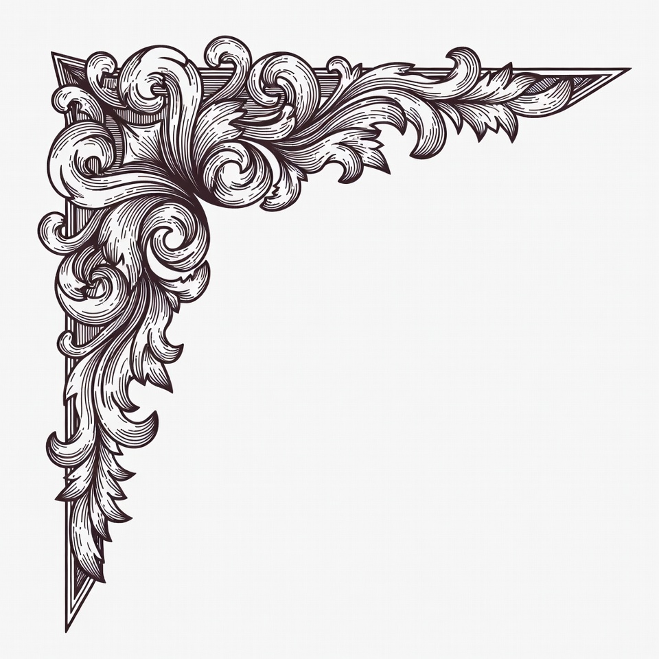 Victorian border, baroque ornament, black ink, clipart, corner ornament, decorative element, engraving style, filigree pattern, floral design, foliage curls, graphic design, illustration, isolated background, line art, ornate border, swirling flourishes, vector graphic, vintage design, white background, corner border