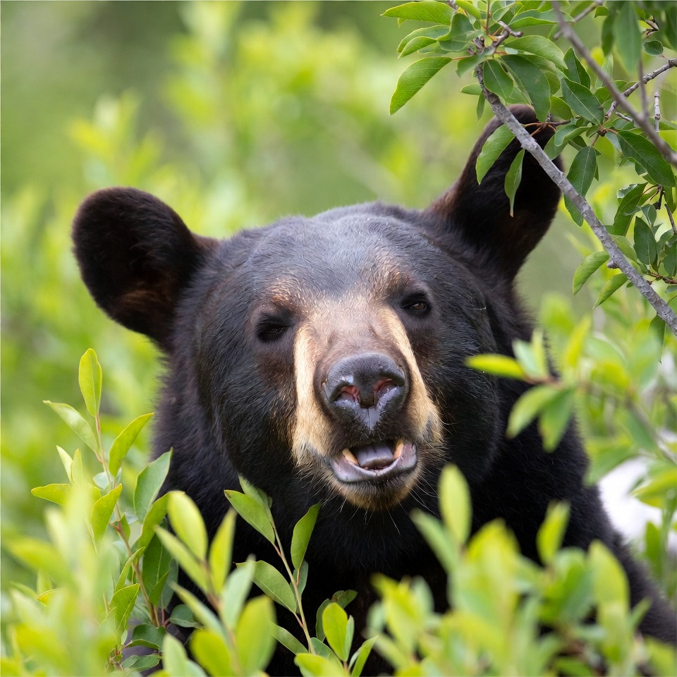 animal, bear, branches, close-up, dark fur, eyes, foliage, forest, glossy fur, green leaves, headshot, mammal, muzzle, nature, outdoors, teeth, wild animal, wildlife, woods, black bear