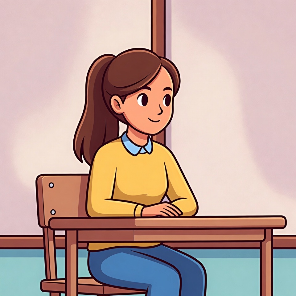 A cartoon girl with brown ponytail and smiling face sits at a wooden desk in a classroom. She wears a yellow sweater with blue collar and blue pants, with hands folded on the desk. The background features large windows with light purple curtains.