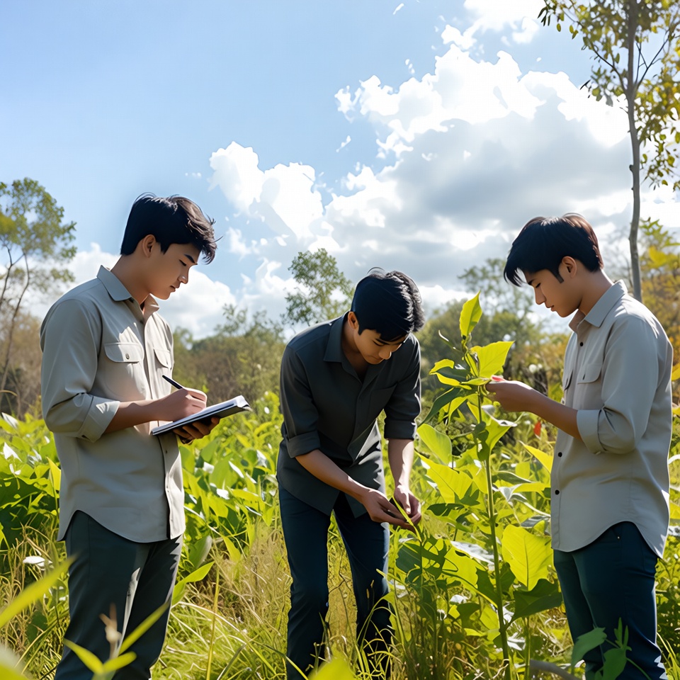 Three young Asian men in uniforms are studying plants in a lush green field under a blue sky with clouds. One man holds a clipboard and writes notes, while another examines leaves closely, and the third inspects a small plant. They stand among tall green vegetation in a natural outdoor setting.