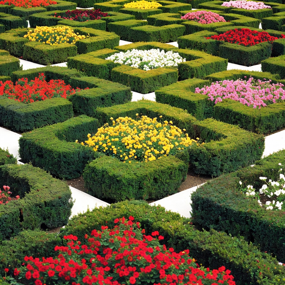 aerial view, boxwood hedges, colorful flowers, floral patterns, formal garden, garden design, geometric garden, green hedges, hedges, landscaping, outdoor garden, pink flowers, purple flowers, red flowers, symmetry, topiary, vibrant colors, white flowers, yellow flowers, flower garden