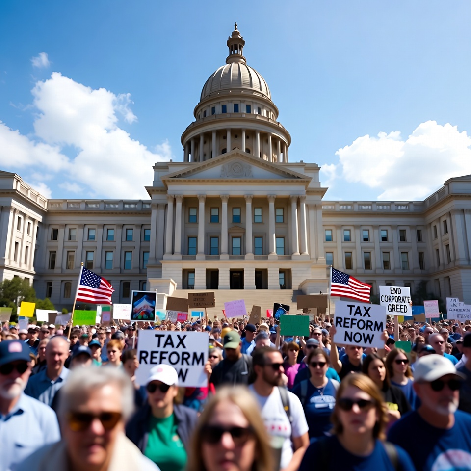 A large crowd of diverse protesters holds signs demanding corporate tax reform in front of a grand capitol building with a golden dome. American flags wave among the yellow, green, and pink protest signs reading 'Tax Corporate Greed Now' and 'End Tax Reform.' Men and women of various ages wear sunglasses, hats, and casual clothing while gathered on the capitol steps under a clear sky.