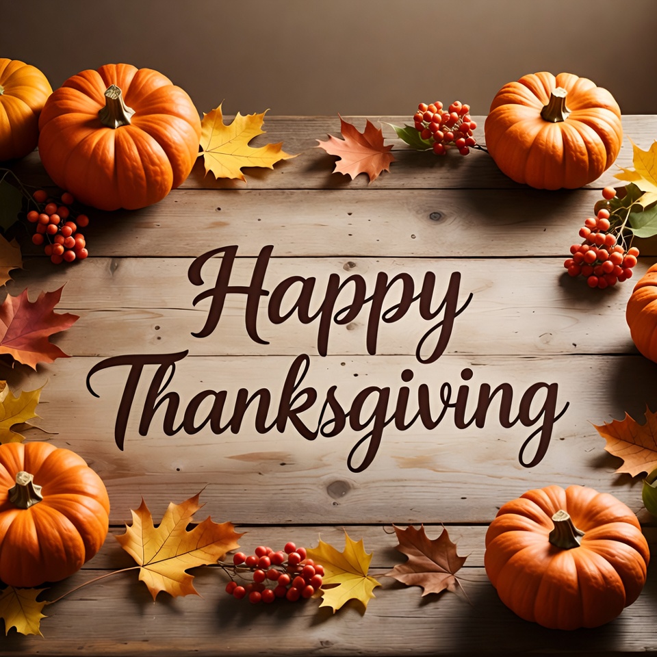 A wooden table displays orange pumpkins arranged in a circular frame. Autumn yellow leaves and red berries are scattered around the pumpkins. Bold text in the center reads 'Happy Thanksgiving'.