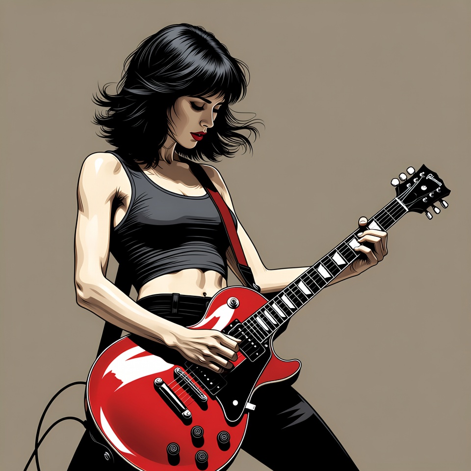 Gibson Les Paul, bevel edge, black hair, black pants, comic art, dynamic pose, electric guitar, female, frets, illustration, instrument, isolated background, long hair, music, musician, performing, playing guitar, red guitar, rockstar, strings, tank top, woman