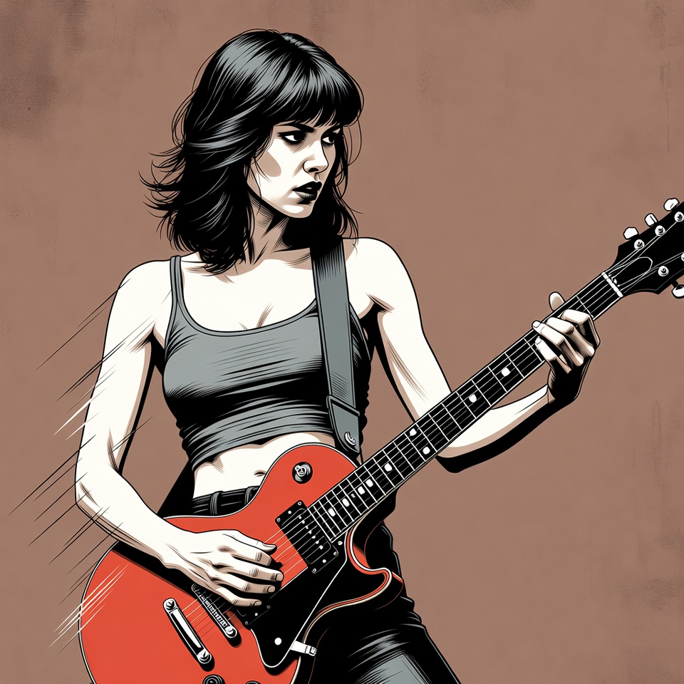 A woman with long black wavy hair and bangs plays a red electric guitar in a dynamic pose. She wears a gray tank top, black guitar strap, and black pants. The illustration features bold lines and a textured brown background.