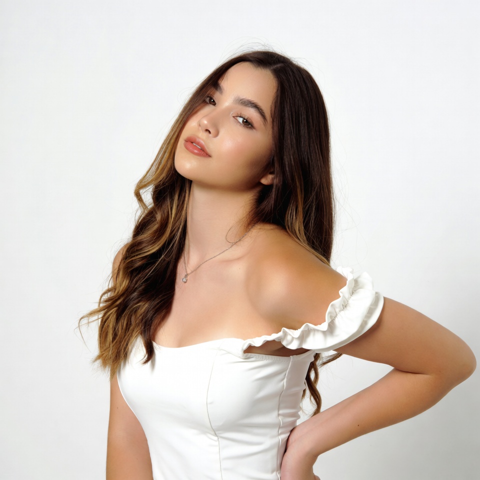 A young woman with long wavy brown hair poses with her head turned to the side against a white background. She wears a white off-shoulder top with ruffled sleeves and a delicate necklace. Her hand rests on her hip as she gazes slightly downward.