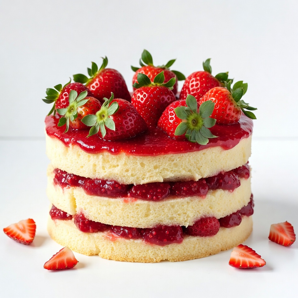 A tall layer cake features white sponge cake alternating with vibrant red strawberry jam filling. Fresh strawberries garnish the top and sides, with additional berries scattered around the base. The cake is presented on a white surface against a plain background.