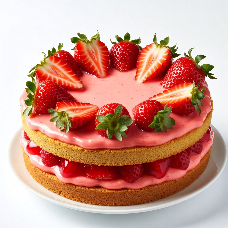 bakery, cake, dessert, food photography, fresh strawberries, fruit topping, golden sponge, gourmet cake, isolated background, jam filling, layered cake, pastry, pink cream, pink frosting, strawberries, strawberry slices, sweet treat, two layer cake, white background, white plate, strawberry cake