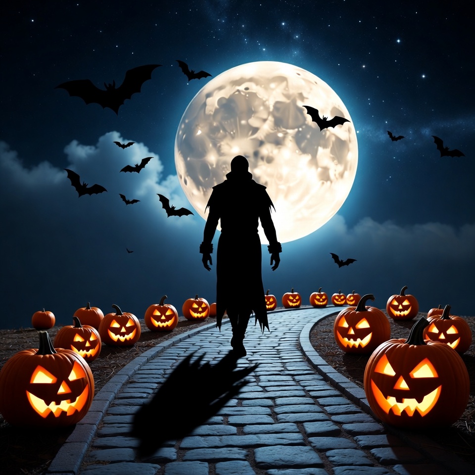 A dark silhouette of a cloaked vampire with a wide collar walks down a cobblestone path lined with glowing jack-o'-lantern pumpkins. Bats fly in the starry night sky around a large full moon. The eerie Halloween scene features dramatic shadows and orange pumpkin lights.