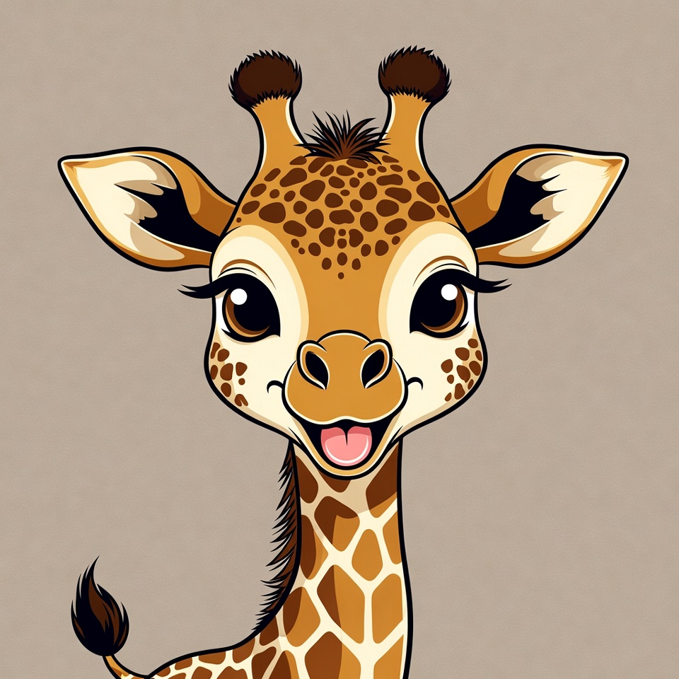 A cute cartoon baby giraffe with large expressive eyes and a big smile faces forward. It features brown spots on a tan body, small horns, and floppy ears. The illustration is set against a plain beige background.