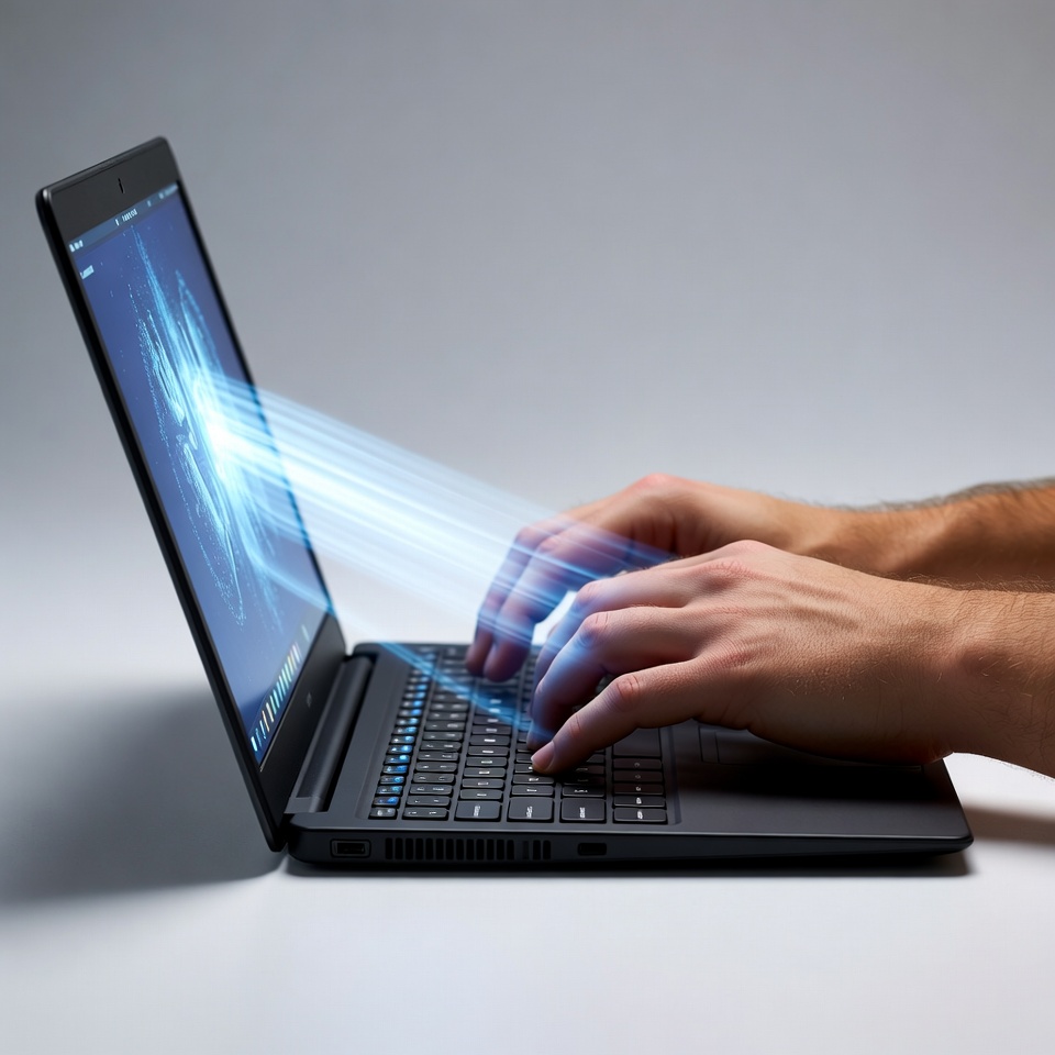 A man's hands are typing on the keyboard of a black laptop placed on a white surface. Bright blue digital light beams and abstract graphics emanate from the screen, creating a dynamic cyber effect. The scene is isolated against a plain grayish background.
